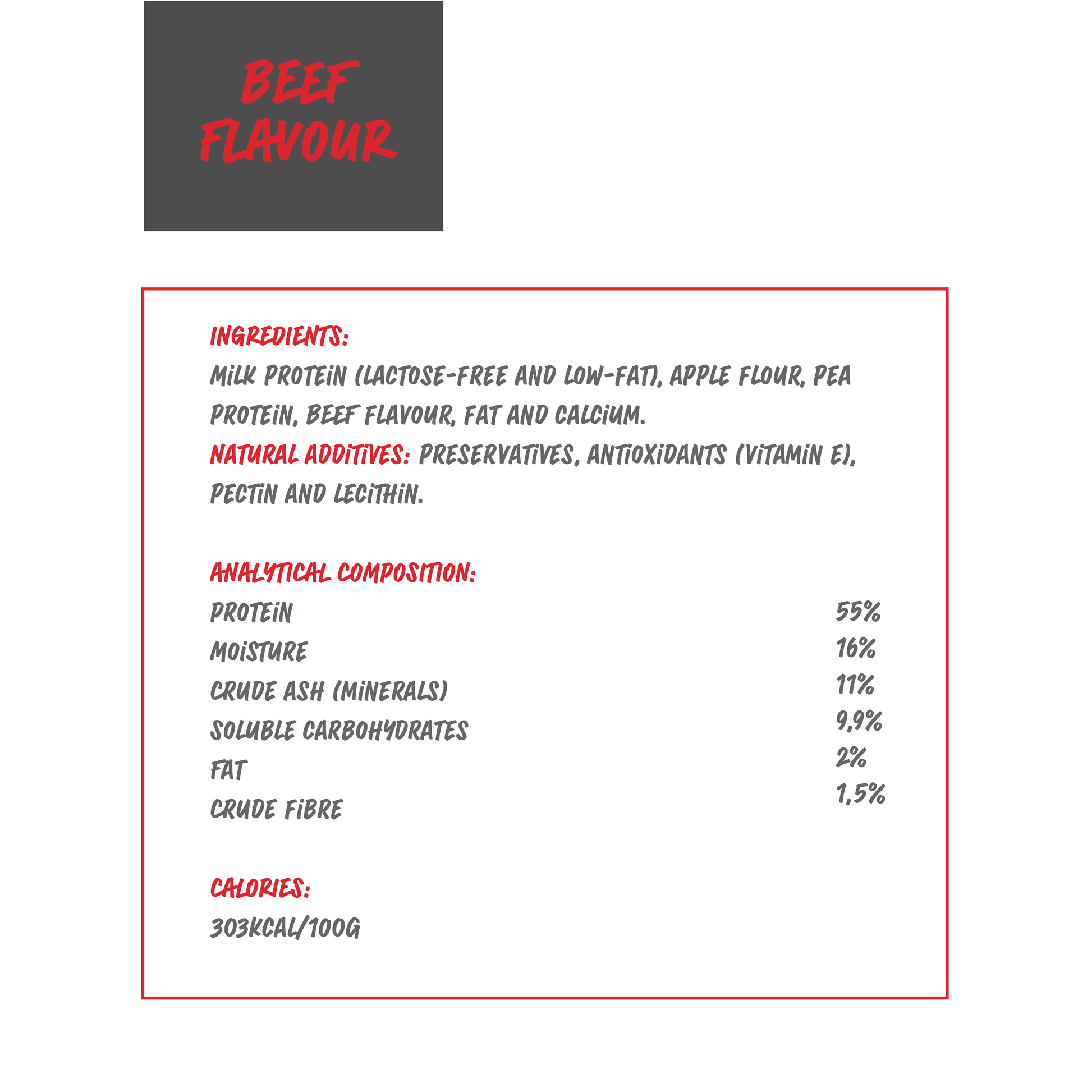 Ingredients: Milk protein, Apple flour, Pea protein, Lard, natural flavor, Calcium.